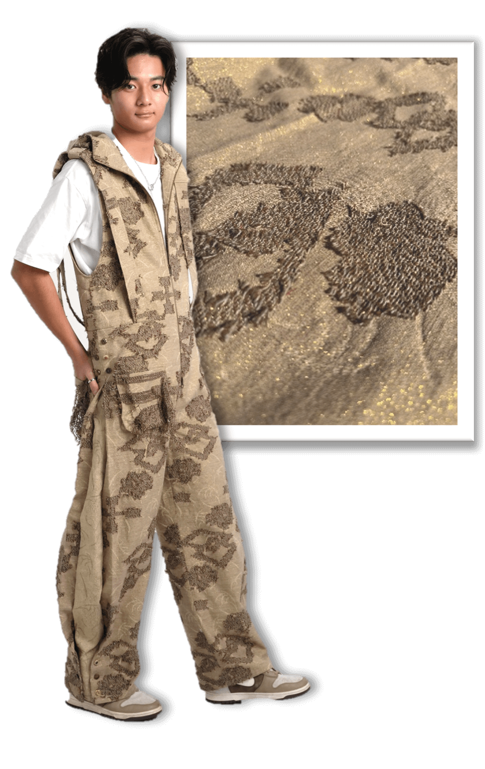 「尾州の稲作」「夕日に照らされ輝く水田」「自然」「和」という4つのキーワードから、尾州の原風景ともいえる田園の情景を織物として表現しました。2/60の金ラメ巻き糸に、1/14の三ツ杢糸(カーキ=緑の苗、自然色・薄グレー=雨と水、レンガ=夕日)を組み合わせて柄を表現ました。「菱形」と「十字」の柄で、絣の伝統的な和柄を使用しつつも不均一な変化をつけ固すぎずモダンでルーズさを、そして「花柄」で自然と開花を表現しました。グランド部分には金巻き糸とモカベージュTOP糸のシェットランドウールを用いて、カットジャカード織で織りあげています。豊かな実りをもたらす稲穂の姿を『つなぎ』として上下一体の造形に落とし込み、「つながり」を象徴的に表現し、フードを取り入れることで、一体感のあるシルエットの中にささやかな変化を加え、現代的な印象へと昇華させました。