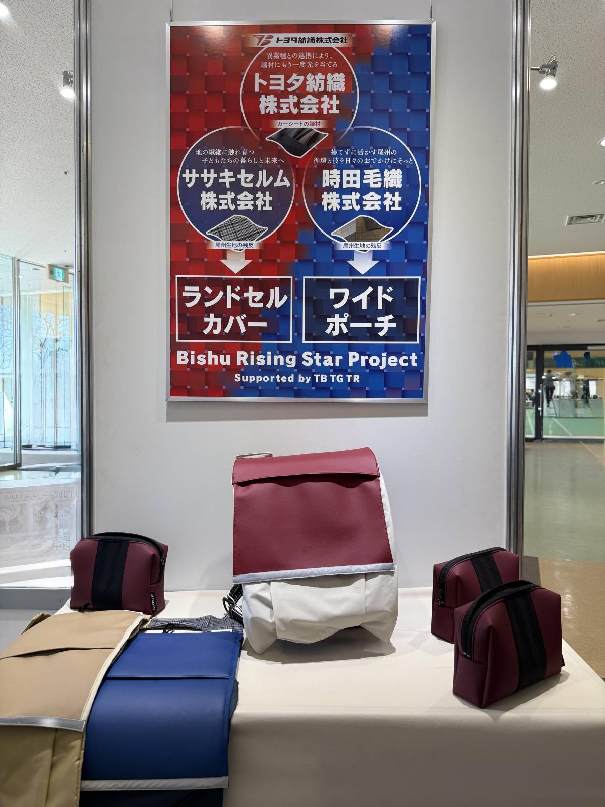 今回、弊社はトヨタ紡織株式会社様との共創により、自動車部品の製造工程で生まれる繊維端材 と、尾州で製造されたデッドストック生地、そして 尾州ならではの技術 を掛け合わせた「アップサイクルポーチ」を制作し、展示いたしました。