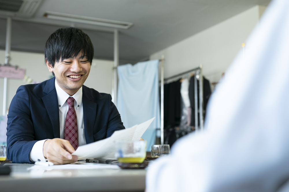 得意先のお店や学校への営業活動をしています。取扱いのない新規の販売店などへアプローチも大事な仕事です。自社で製造するセーラー服を企画し、販売店での採寸応援まで幅広く行っています。