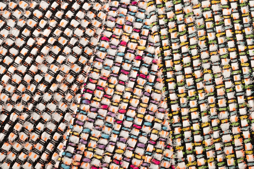 本来は不要となる織物をテープ状にし(裂織:サキオリ)のヨコ糸として使用、テープをタテ糸に使用する事で滝の様な織物(滝織:タキオリ)にしています。