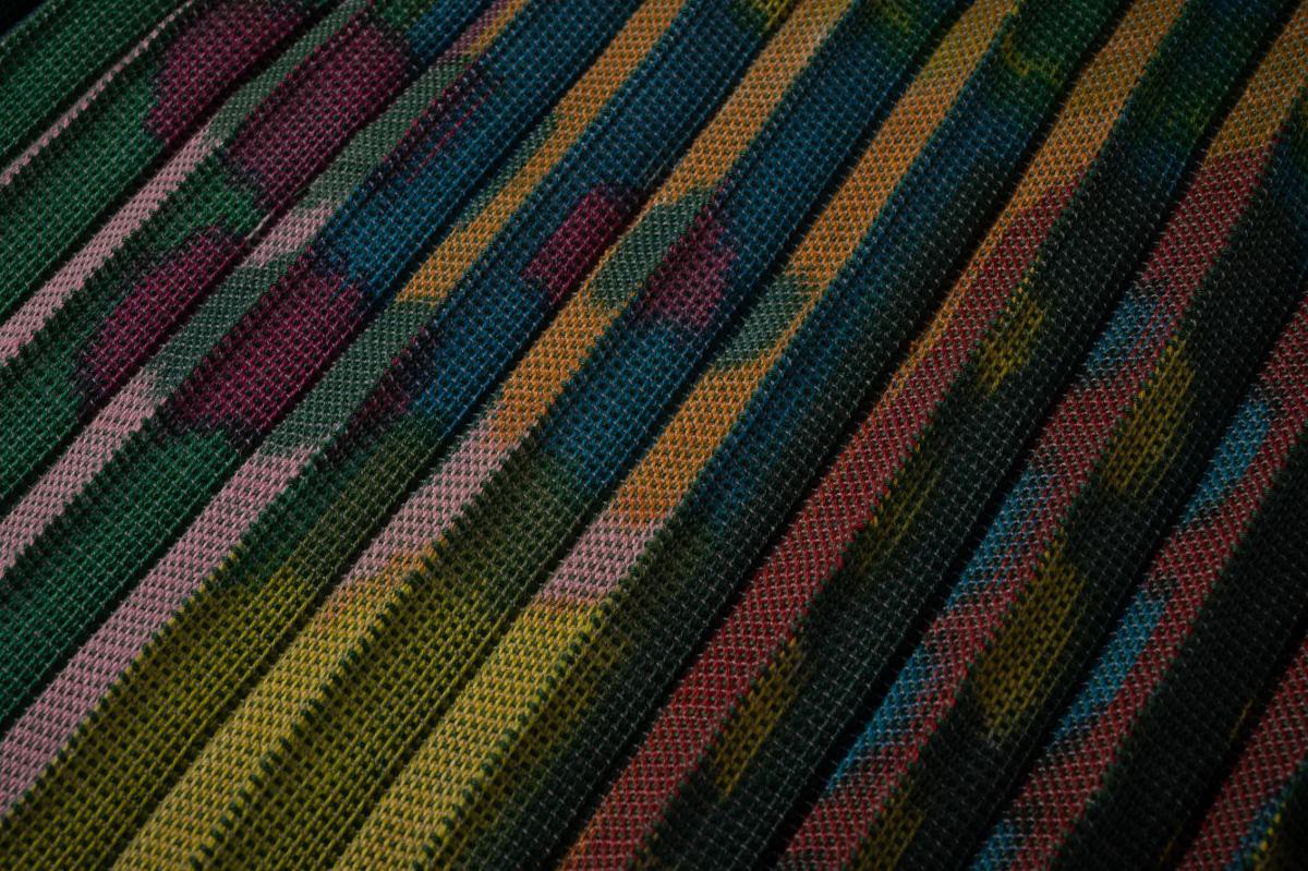 日常の何気ない記憶に残る景色をテキスタイルで表現したノスタルジックな作品に心を惹かれました。 天然染料の深みのある情緒豊かな色合いのグラデーションは〝夕焼けの空が海に移る景色〟を見事に表現しています。 自然由来のものからパワーをいただきそれを身に着けることの心地よさを感じ癒されました。