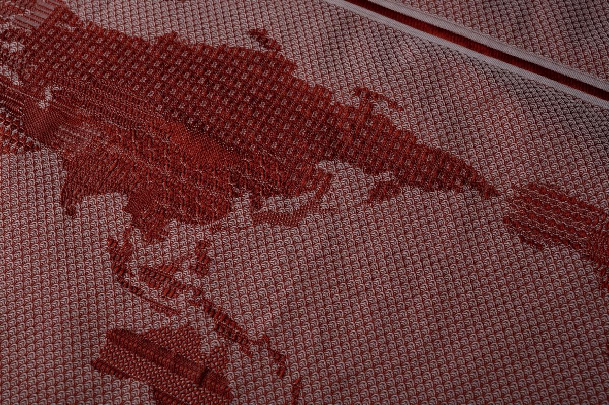 繊細なジャカード織りで表現された世界地図がユニークで目を引きました。 よく見ると確かなジャカード技術で70種類以上の伝統柄が繊細にアウトラインを形成し、あえて国境を柄で分けない手法で文化の尊重と協調性を表している部分に西川さんの世界平和を願う熱い想いを感じました。 その高い表現力と着眼点を評価させていただきました。 今後の西川さんのご活躍を期待しています。頑張ってください。