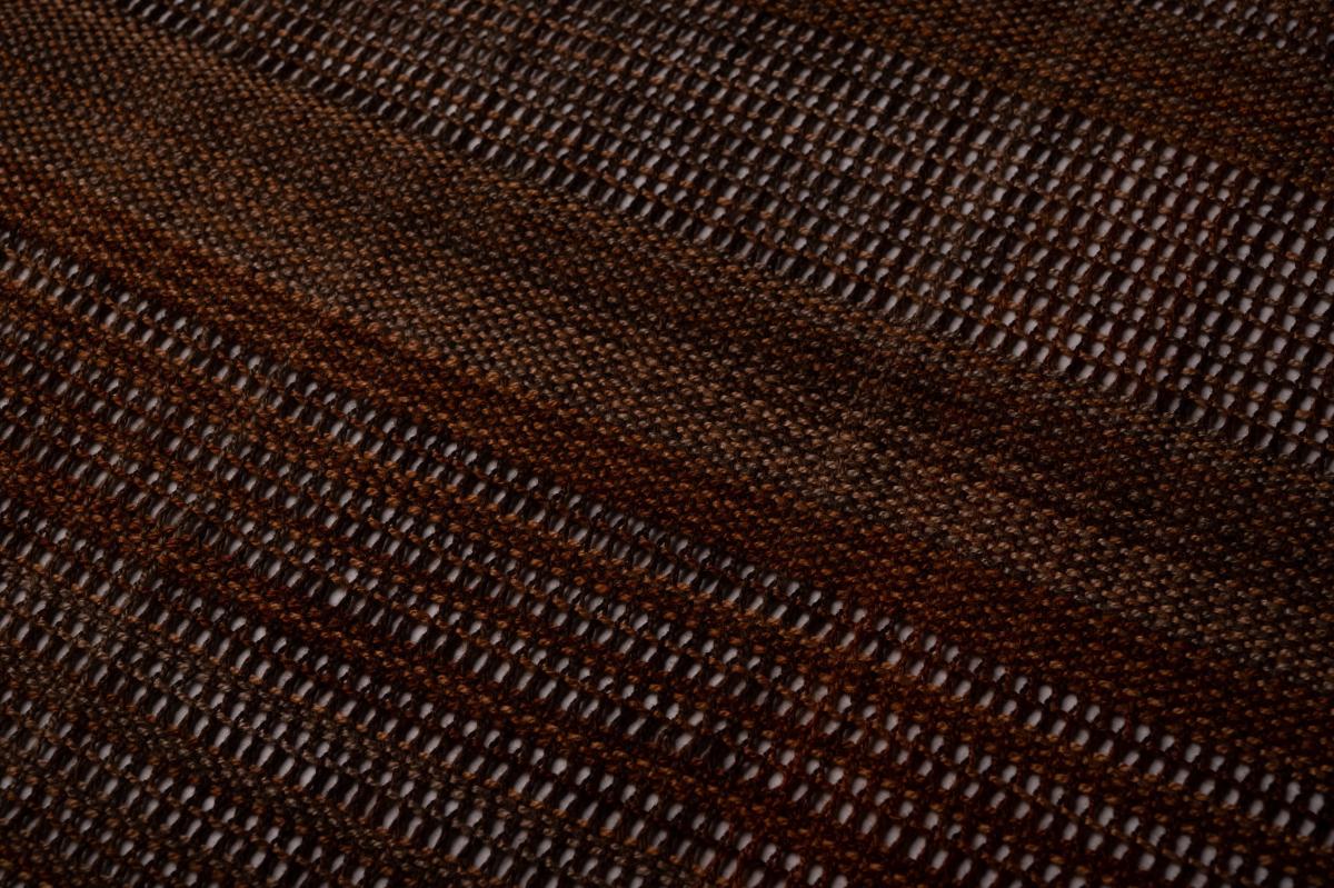 本作品は、同じ染料で染めることにこだわり、年々注目さてる草木染の表現の可能性を追求したポイントを高く評価しました。 からみ織によって糸一本一本の表情を際立たせるところと、平織りによってメランジ風に見せるところを上手にコントラストとして表現し、また全体的に軽く仕上げているあたりにセンスを感じました。