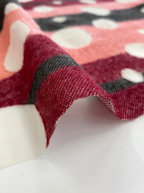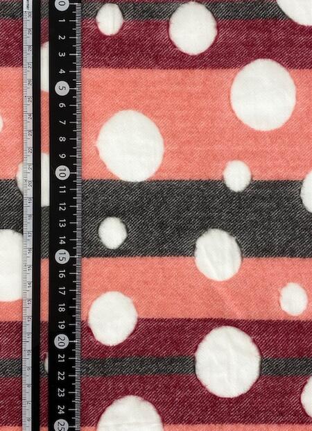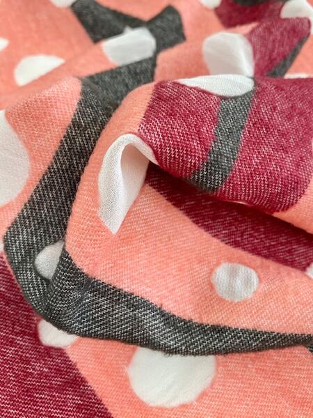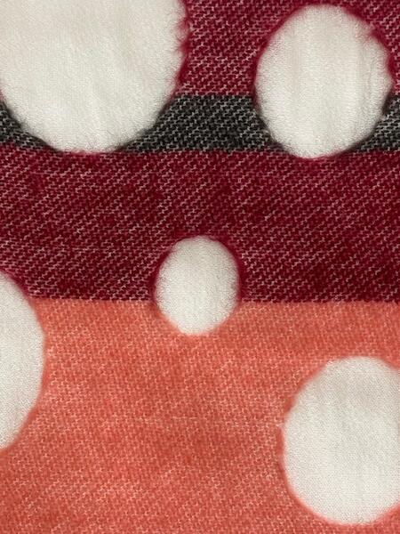 ピンク、ワイン、茶、の配色にオパール加工(部分的に繊維を溶かす)で丸玉を抜きグランドの白地との差を引き立てています。