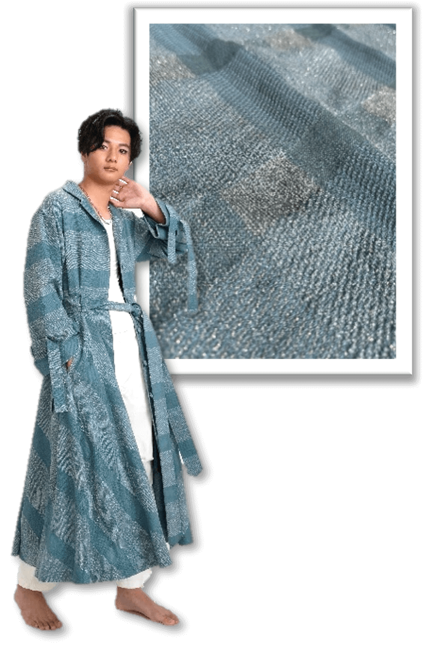 真清田神社境内の服織神社には女性の神様が祀られている一方、川の神は古来より男性とされてきました。川の恩恵によって発展してきた尾州産地だからこそ、この対比から着想を得て、ジェンダーレスなコートとしてガーメントをデザインしました。