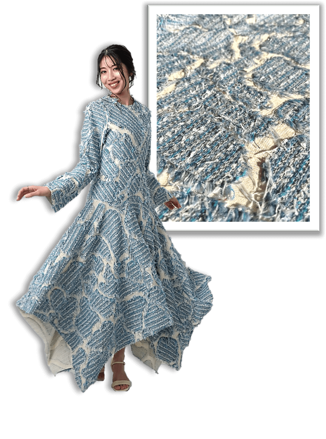 柄は海面の揺らぎから着想を得ています。春夏らしさを表現するため裏糸には綿を用い、色調はブルーやサックスを基調に構成しました。さらに、海のきらめきやリゾートの空気感を表現するため、スパンコールやラメ入り意匠糸を用いました。カットジャカードで編み上げた後、軽く整理加工を施し、チーム全員で飛び糸をカットして、海らしい表情へと仕上げました。
